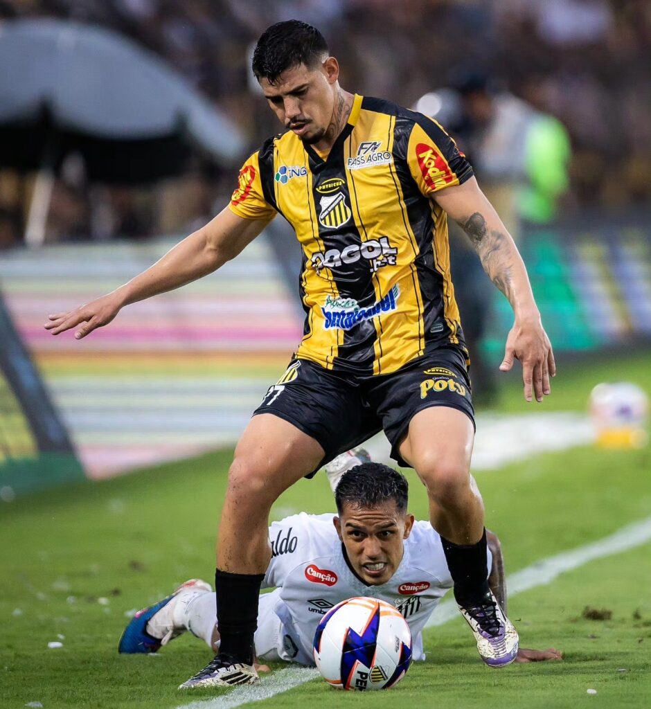 A imagem, feita no Estádio Jorge Ismael de Biasi, mostra a vitória do Novorizontino por 2 a 1 sobre o Santos, com Neymar em campo e o instante em que Igor Vinícius, deitado, observa a jogada enquanto Mayk protege a bola, síntese de precisão, leitura e sensibilidade estética.