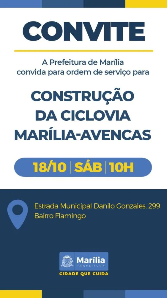 O prefeito Vinicius Camarinha dará a ordem de serviço para a implantação da Ciclovia de Avencas, que será construída ao longo da Estrada Municipal Danilo Gonzales (MAR-030), conectando a cidade ao distrito de Avencas. O evento de assinatura será neste sábado (18), às 10h, na Estrada Municipal Danilo Gonzales, em frente ao número 299, no Jardim Flamingo.